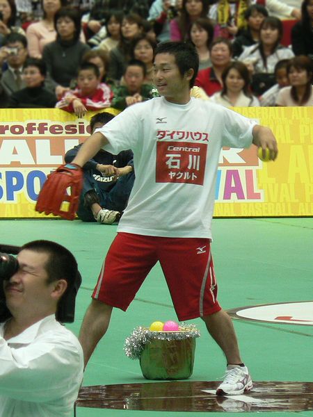 小学生野球チーム相手に投げる石川投手。